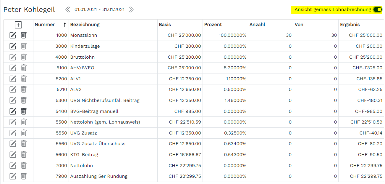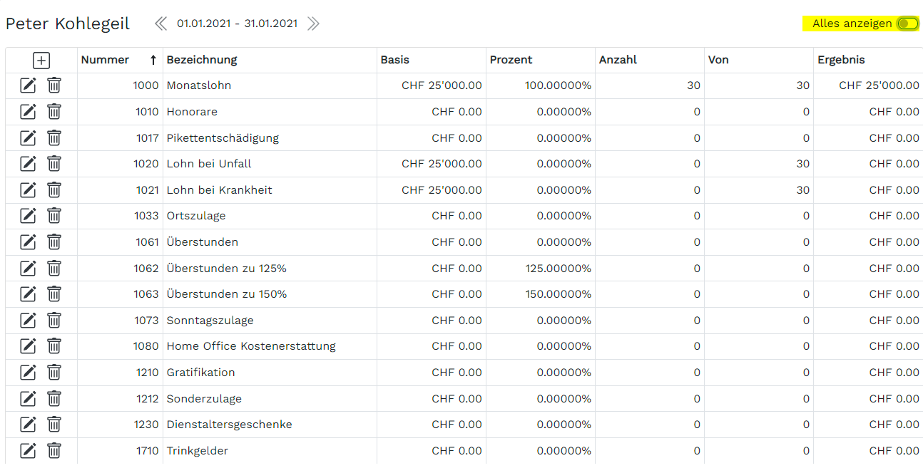 Welche Lohnarten in der Lohnberechnung angezeigt werden, können Sie selbst bestimmen. Möchten Sie nur die Lohnarten sehen, die danach auch auf der Lohnabrechnung gedruckt werden oder sollen alle Lohnarten angezeigt werden, damit Sie allfällige manuelle Erfassungen von Zulagen, Spesen und Abzügen vornehmen können?