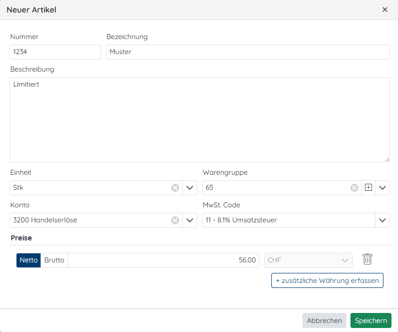 Jeder Artikel besitzt eine eindeutige Artikelnummer (kann auch alphanumerisch sein). Nebst der Bezeichnung kann auch eine mehrzeilige Beschreibung gespeichert werden, die ebenfalls auf die Rechnungen, Offerten usw. gedruckt wird.