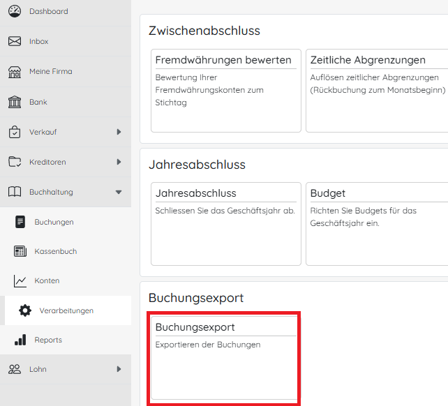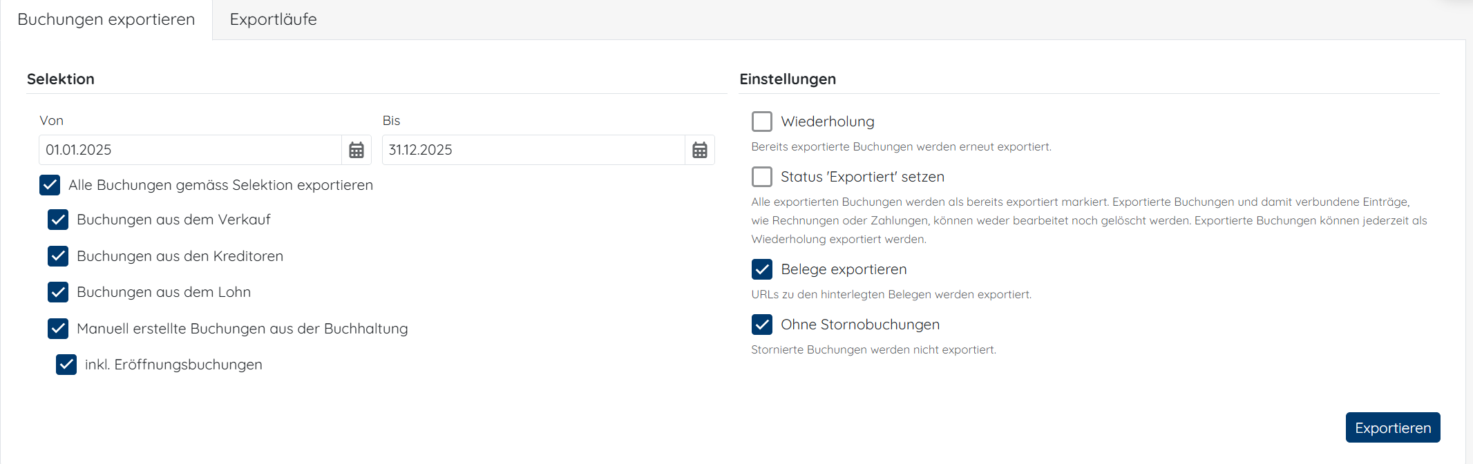 - Aus welchen Bereichen die Buchungen exportiert werden sollen