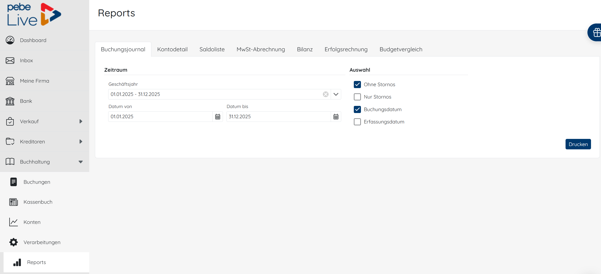 Das Buchungsjournal zeigt die Buchungen der gewählten Periode mit allen Buchungszeilen.