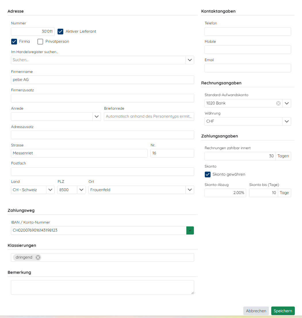 Im ersten Register „Adresse“ können Sie beim Typ „Firma“ die Daten auch mittels Suche im Handelsregister automatisch abfüllen. Für Schweizer Adressen steht das Postleitzahlverzeichnis zur Verfügung.