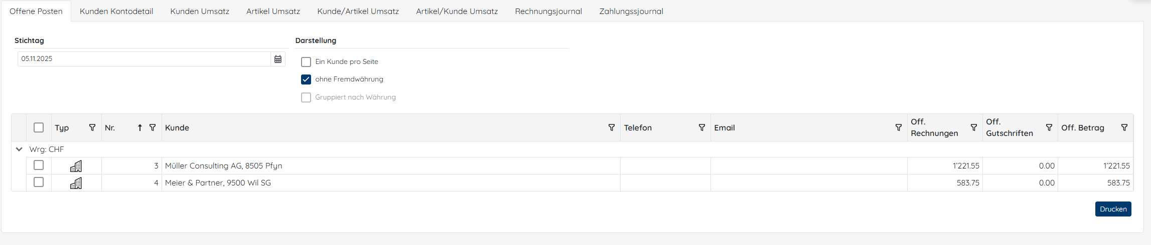 < Alle Themen Haupt Verkauf Reports Verkauf Offene Posten-Liste Verkauf Drucken Offene Posten-Liste Verkauf Aktualisiert6. November 2025Bei dieser Funktion können Sie die Offene Posten-Liste der gewünschten Kunden drucken.Sie können das Stichdatum eintragen und beim Druck optional anwählen, ob pro Seite nur ein Kunde dargestellt werden soll.
