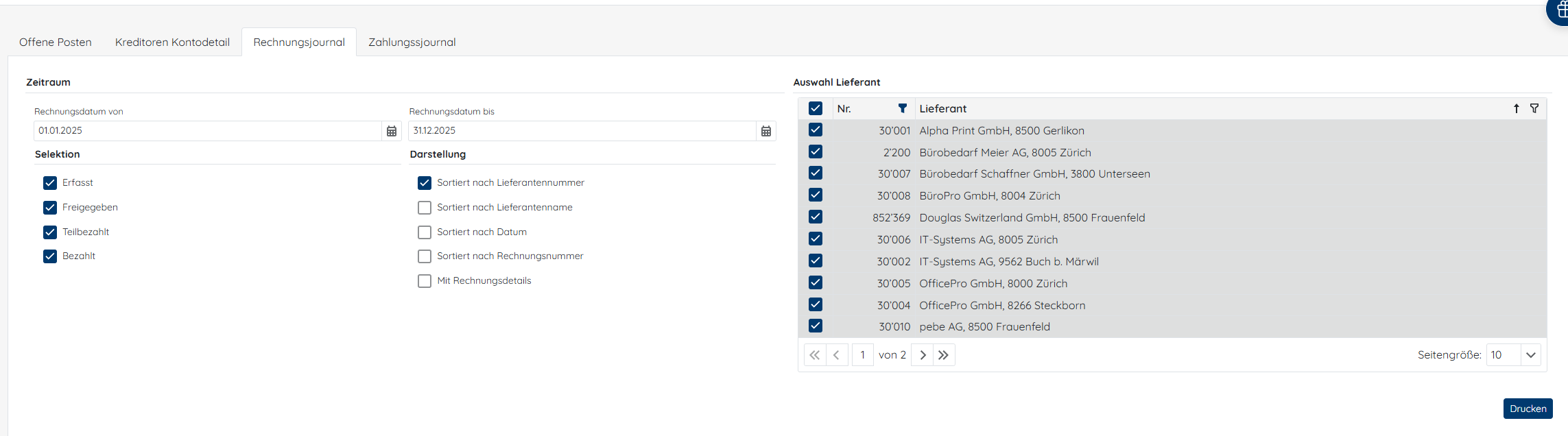 Die gewünschte Zeitspanne kann selektiert werden. Die Rechnungen können nach ihrem Zahlstatus gefiltert werden. Die Darstellung kann nach Lieferantennummern, Lieferantennamen, Datum, Rechnungsnummern oder mit Rechnungsdetails erfolgen.