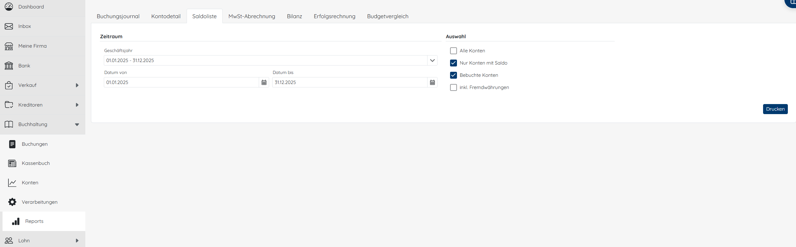 Die Saldoliste zeigt die Salden der Konten der gewählten Periode.