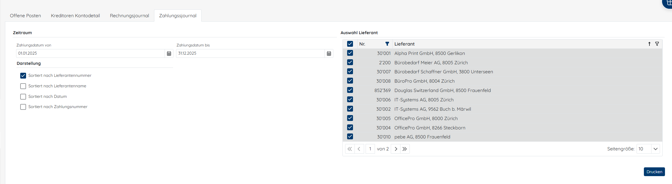 < Alle Themen Haupt Kreditoren Reports Kreditoren Zahlungsjournal Drucken Zahlungsjournal Aktualisiert7. November 2025Hier können Sie alle Zahlungen in der ausgewählten Zeit Periode sehe und drucken.Sie können die Darstellung nach Lieferantennummern, Lieferantennamen, Datum oder Zahlungsnummer anpassen.